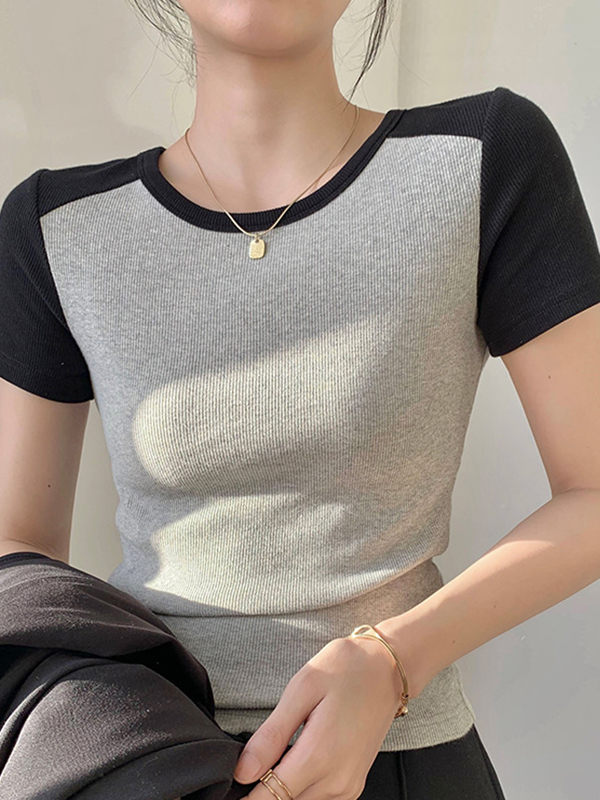 Kurzarm-Strickpullover mit Rundhalsausschnitt und kontrastierenden Nähten