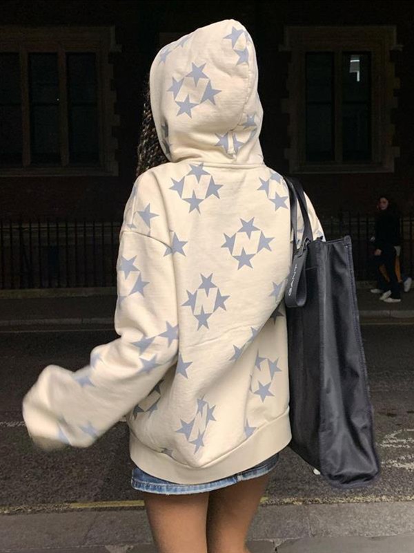 Beschreibung: Diese kuscheligen Hoodies haben eine entspannte Silhouette, einen Sternmusterdruck, überschnittene Schultern, funktionelle Taschen und einen Reißverschluss.