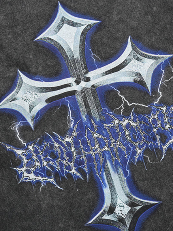 Dieses auffällige schwarze T-Shirt mit einem großen blauen Kreuz, das mit komplizierten Mustern verziert und von einer kontrastierenden blauen Umrandung eingefasst ist, schafft einen optisch fesselnden Blickfang.