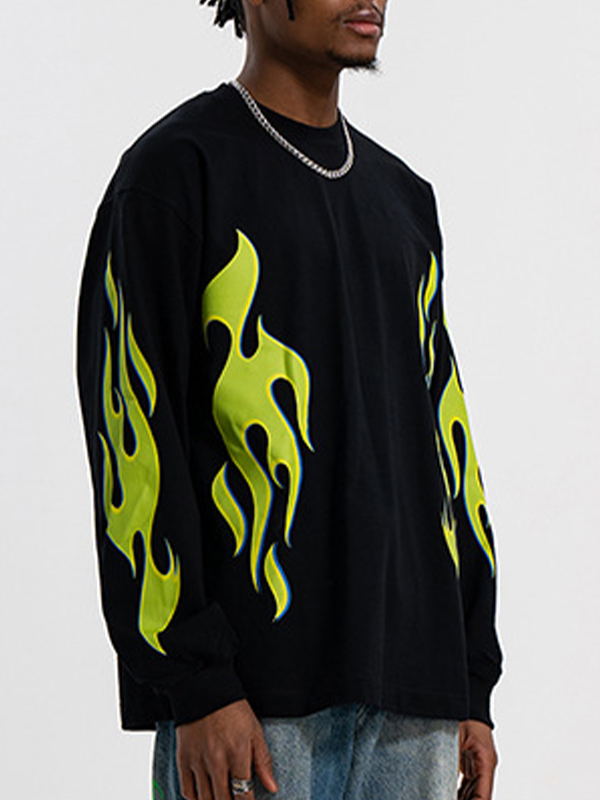 Herren-Langarm-T-Shirt mit leuchtend grünem Flammen-Print